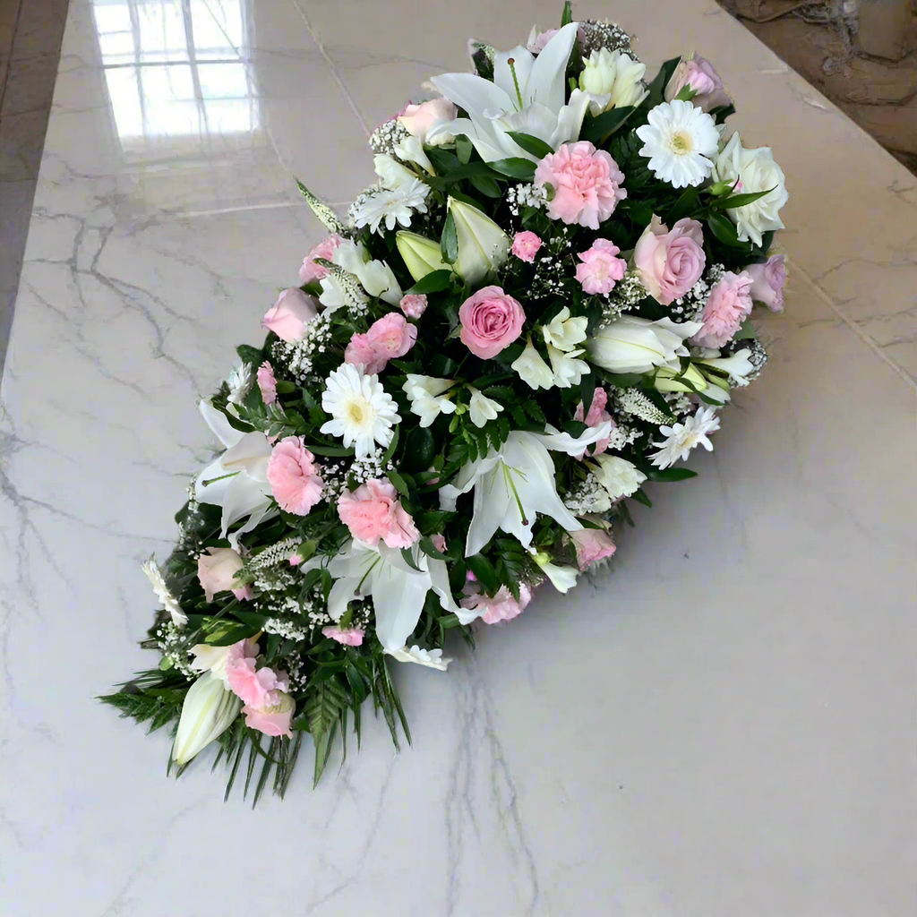 Teardrop Single Ended Coffin Spray, 4ft in length. Comprises of 4 main flower components and a foliage to create this stunning tribute. Lillie's are a firm favourite amongst funeral tributes, symbolising purity of the soul.