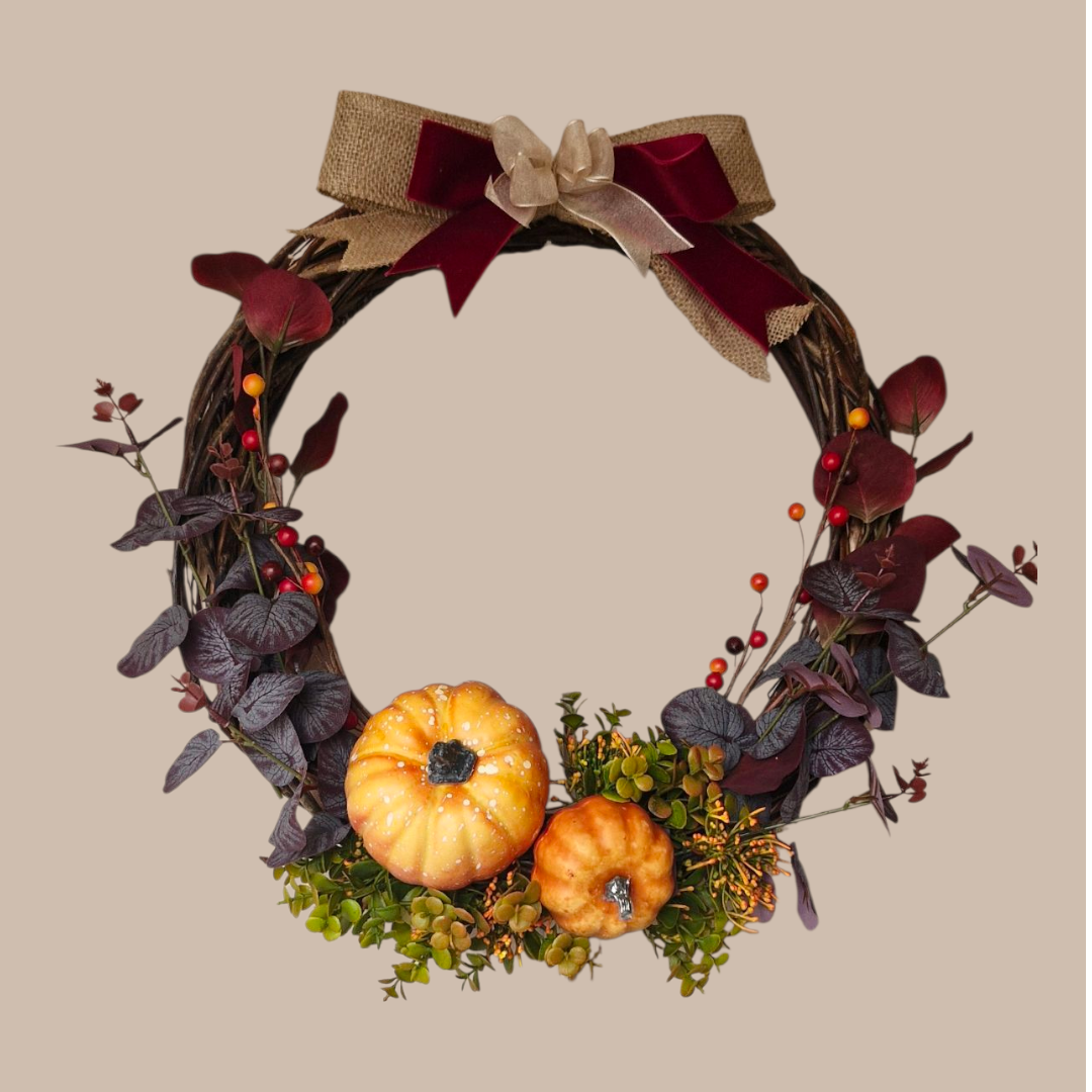 Here we have our Burgundy Delight in all it's glory. Set upon a distressed willow ring, framed with mix of dried ruscus stems alongside the gorgeous deep balmoral eucalyptus, showcasing the multi-tonal pumpkins amidst its foliage. This lovley wreath is finished with a layered hessian and velvet bow to compliment its natural beauty.