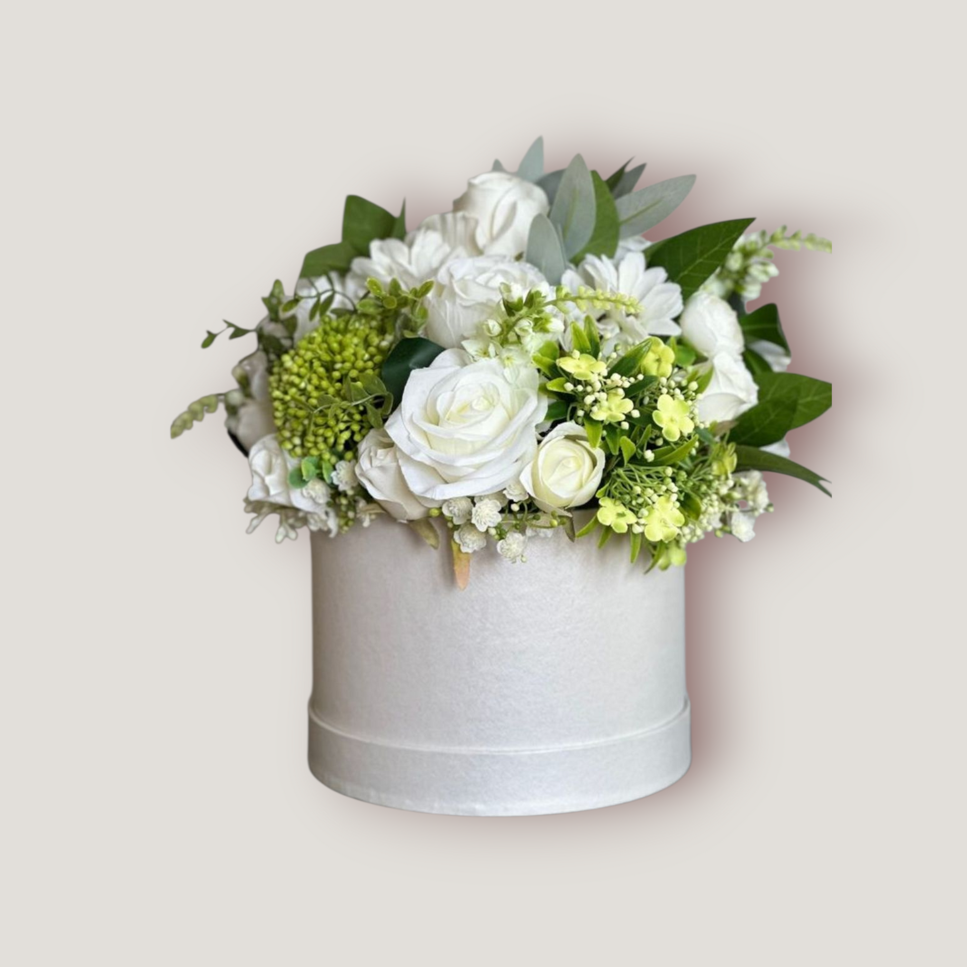 Here we have our Elegance Bouquet, desgned in medium hat box with oasis base, keeping your flowers at their best for longer. sophisticated in style with it's neutral tones of creams and greens.